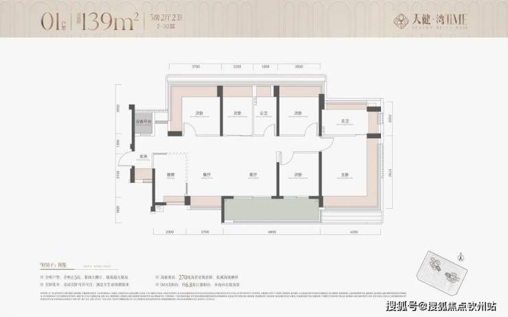 建面约139㎡正5房奢阔横厅户型一步到位,满足家庭生命全周期需求。约6.8m全画幅宽尺阳台+全屋采光+主卧套房270°超广角海景飘窗,带来沉浸式的海幕享受。
