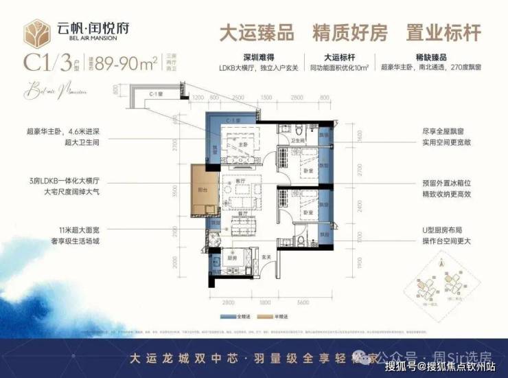 89㎡3房2厅2卫:设计的是经典横厅格局,LDKB一体化,进门入户玄关,客厅带3.5米阳台,U型厨房,主卧南北通透270度景观,卫生间干湿分离。