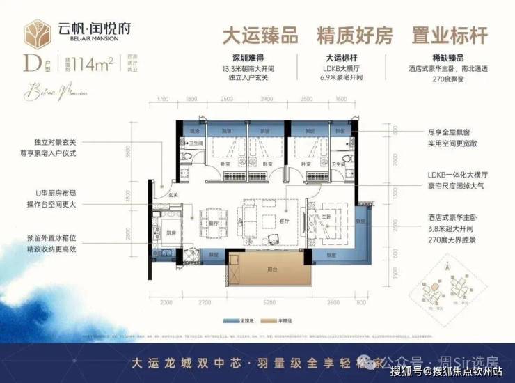114㎡4房2厅2卫:设计的是经典大横厅格局,LDKB一体化6.9米开间,进门入户玄关,客厅带5.2米大阳台,U型厨房,主卧南北通透270度景观,卫生间干湿分离。