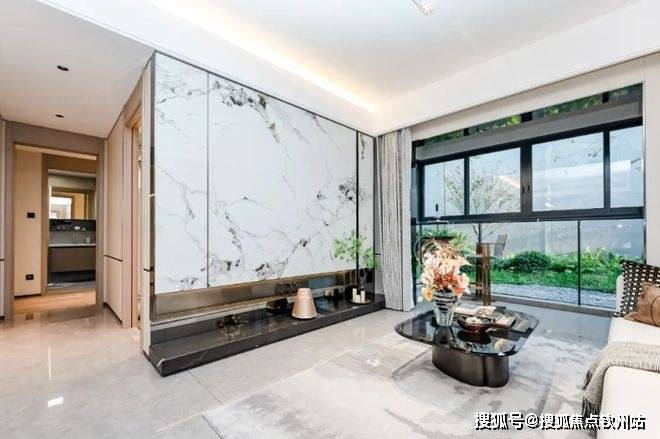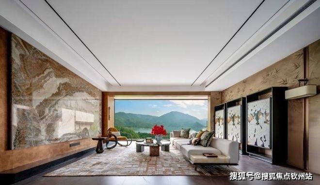 步入客厅,首先映入眼帘的是面宽1000米的南屏水库湖景,远处是连绵起伏的黑白面将军山,让人不禁心生向往。