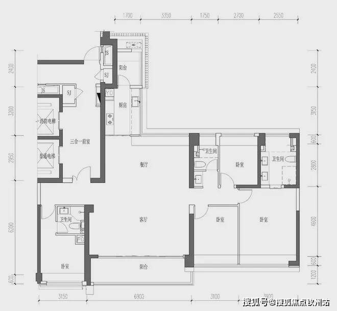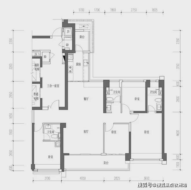 169㎡户型:4房2厅3卫,竖厅格局,2梯2户,专梯入户,得房率约68.58%(不含赠送),正南朝向。