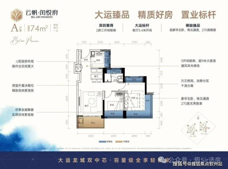 74㎡2房2厅1卫:设计的是经典竖厅格局:,进门入户玄关,S墙预留冰箱位,客厅3.4米开间,U型厨房,三开间朝南,主卧南北通透270度景观,卫生间干湿分离。
