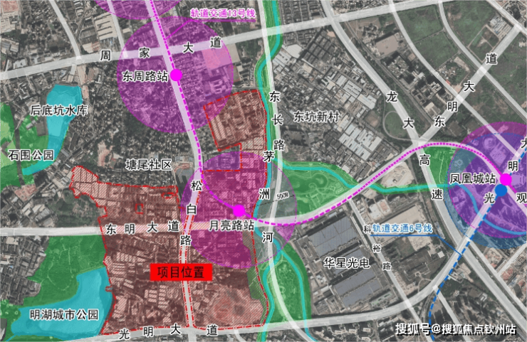 华润润宏城位于光明区凤凰街道塘尾社区,光明大道和东长路交汇处的西北侧,刚好在13号线“月亮路站”附近,北部接壤东周路。