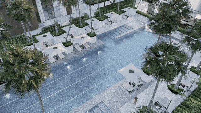 社区内的生态环境也堪称一绝,新加坡JTL景观设计大师,把迈阿密酒店式隐奢滨海度假风融入园林中。