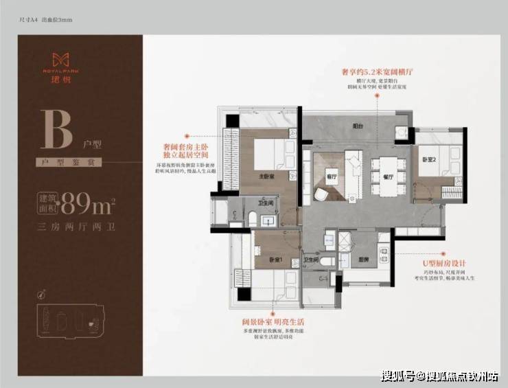 89㎡的3房2厅2卫,A户型(1栋1单元06户型),设计的是经典竖厅格局,进门入户玄关,LDKB一体化,S墙设计预留冰箱卡槽位,三开间朝南,动静分区,主卧双面大飘窗,客厅连接次卧出5.6米长的观景阳台,U型厨房,公卫三段式分离,东南朝向。