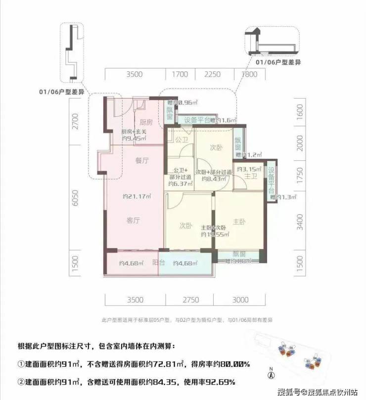 81㎡的3房2厅2卫,设计的是竖厅南北通透格局,客厅3.4米开间,3个卧室分别是3米/2.6米/2.2米的宽度,L型厨房,得房率:94.35%(包含赠送),阳台西北或东北朝向。