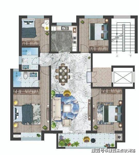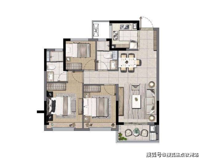 户型注重实用性,独立玄关、客餐一体、三段式干湿分离卫浴,细节贴心。