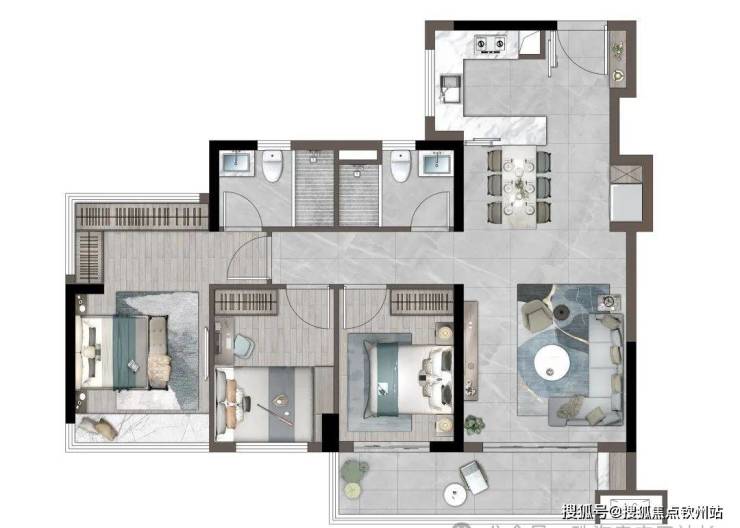 89㎡丨三房两厅两卫; LDKG一体化设计;U型厨房;约6米双面宽超大景观阳台;独立卧室带独立卫浴;主题设计儿童房