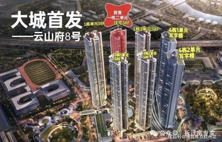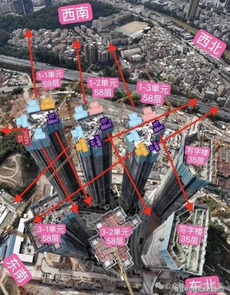 项目由8座建筑分2排组成,1栋1-2-3单元和3栋1-2单元为58-59层(约180米)住宅,标准层高2.9米,4梯6户;4栋1-2单元为35层(约165米)写字楼,2栋为幼儿园。地块住宅均为商品房性质,有1566户,配2220辆车位。