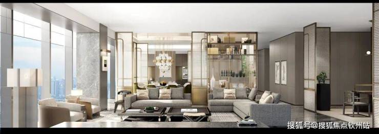 客厅设置为约12米高中庭 ,配备近13米面宽一体客餐厅 ,270°全尺度落地窗 ,让城市繁华,成为你和家人共享美味时的一份佐料。
