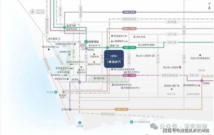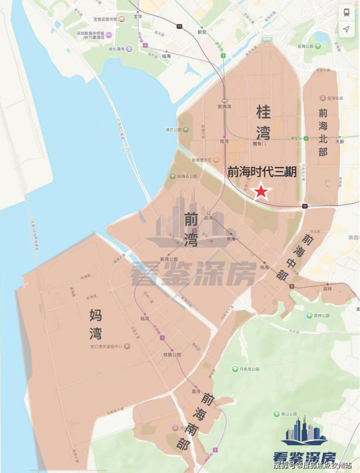 「前海时代三期尊府」位于前海桂湾片区南侧,临近滨海大道和桂湾河,在整个前海自贸区内算是住宅的C位,正南侧水廊道公园,东南望南山西南看城市海景。 整个「前海时代」大项目规划总建面约130万㎡包括了商业、写字楼、公寓、酒店、住宅,可以算是一个超大型的综合体。其中商业将会交由华润运营,连接万象前海商业。