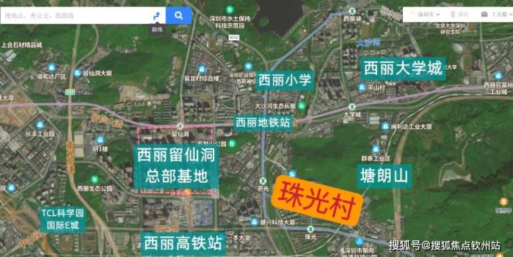事实上,珠光村的整体区位较为优越,具体位置方面,该项目附近有7号线地铁站珠光站和茶光站,直线距离分别约400米和700米,从茶光站出发一站即到西丽地铁站(5号线环中线和7号线的换乘站),另外项目2公里范围内还规划有西丽高铁站。