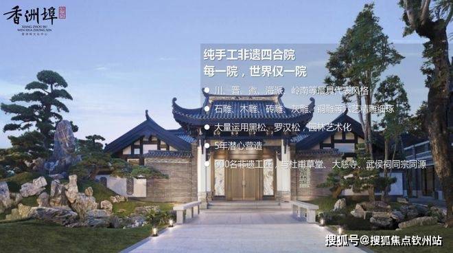 香洲埠占地约 9.5 万平方米,建筑面积约 16 万平方米,总投资 14 亿元。整个街区以四川成都洛带博客小镇为蓝本打造,集休闲、娱乐、餐饮、民俗、民间工艺、非物质文化遗产于一体。它汇聚了川、徽、晋、海、岭南等五大派系建筑文化,136 座中式院子风格各异,按照 “一轴两核,五街多巷” 的规划布局,营造出丰富的空间情趣。而且,这里的建筑都是由 600 名非遗工匠,采用 “曲阳石雕、东阳木雕、徽晋砖雕、川西灰塑、河北铜雕” 等五大非遗工法精雕细琢而成,历时 5 年才大美呈现。