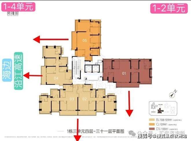 户型设计方面,梯户比为1-2,1-3单元31层高,1-4单元37层高2梯5户、1栋1单元31层高2梯6户,户型设计有95-108-109-138㎡得房率在92-98%左右