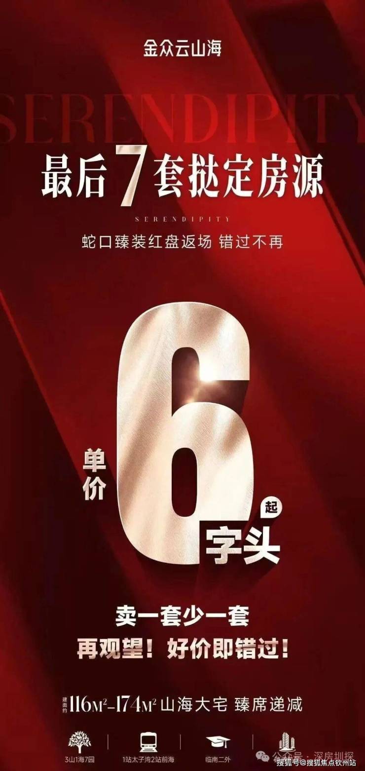 金众.云山海 坐落于深圳市南山区蛇口招商街道赤湾六路与港航路(郑和一路) 交汇处,项目共两个地块(宗地号K104-0043、K104-0044)(东区、西区),总用地面积约3.6万㎡,规划总建筑面积约19.5万㎡,其中计规定建筑面积约19万㎡,包括住宅、商业(800㎡)和幼儿园等配套用房。