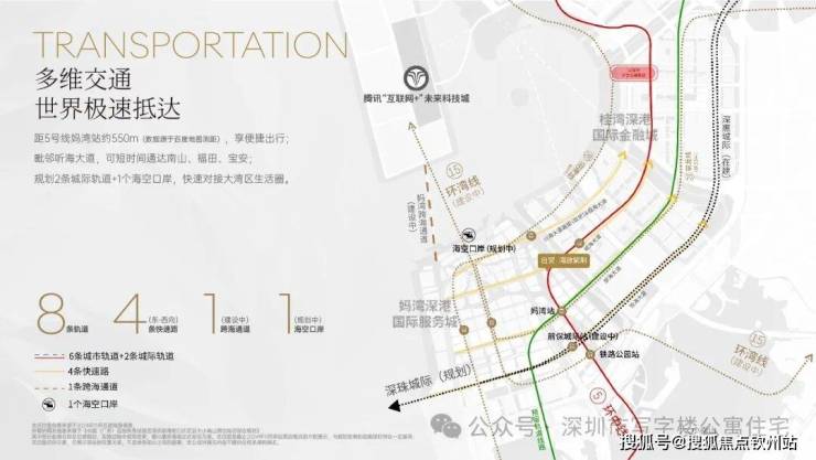 【交通】立体便捷交通,更便捷高效出行距5号线妈湾站约550m,毗邻听海大道,可快速通达南山、福田、宝安及大湾区生活圈;规划8条轨道(城际+城市)、4条快速路、1条跨海通道(建设中)1个海空口岸(规划中)。