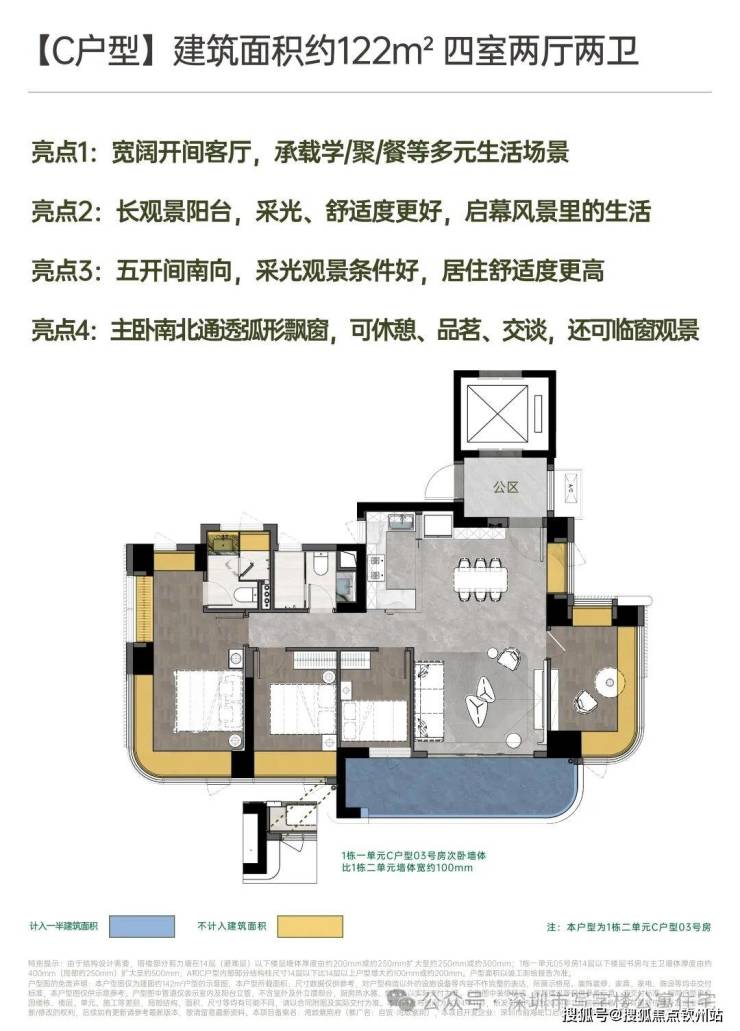 项目共规划主力为3-4房产品:建面约142㎡南北方厅 阔景四房;