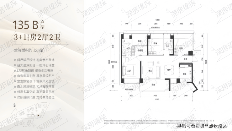135㎡的4房2厅2卫,B户型(2栋4单元06户型),设计的是横厅南北通透格局,进门入户玄关,客餐厅7.2米开间,LDKB一体化设计,四开间朝南,4个卧室分别做到了主卧19.08㎡/次卧14.3㎡/次卧11.7㎡/次卧11.7㎡(包含墙体飘窗),客厅连接次卧出6.8米长的观景大阳台看深大校区,U型厨房,卫生间干湿分离,得房率约90%(包含赠送),阳台主朝西南向。