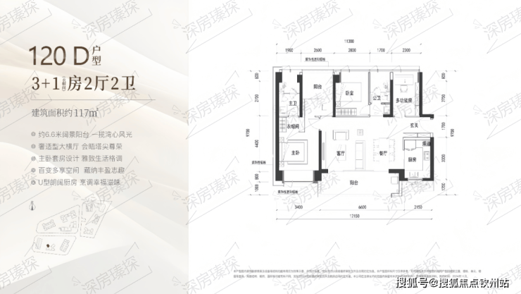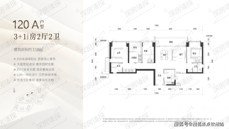 118㎡的4房2厅2卫,A户型(1栋1/2单元01户型),设计的是横厅格局,进门入户玄关,客餐厅6米开间,LDKB一体化设计,4个卧室分别做到了主卧17.65㎡/次卧11.02㎡/次卧9.12㎡/次卧8.74㎡(包含墙体飘窗),客餐厅出6米长的观景大阳台看深大校区,U型厨房,公卫三段式分离,得房率约90%(包含赠送),西北朝向。