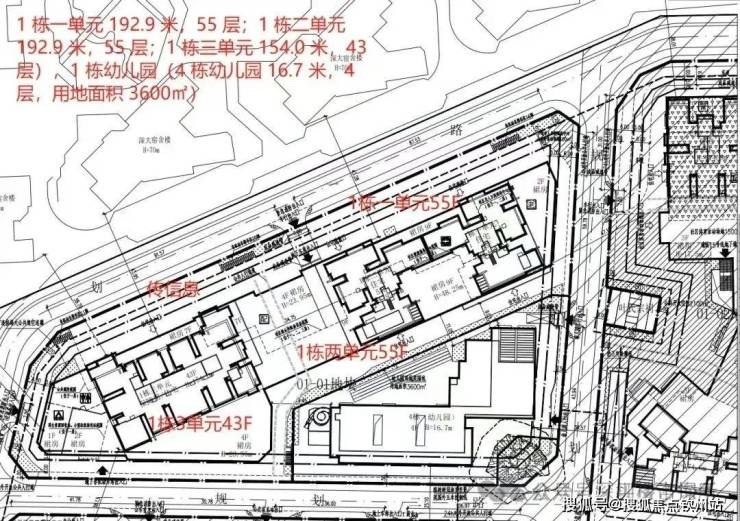 规划为3栋超高层塔楼住宅+幼儿园,1栋一、二单元193米55层,1栋三单元为保障房157米44层。