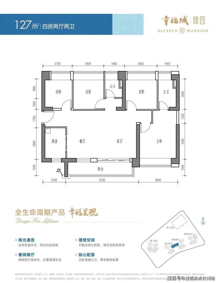 127㎡:4房2卫横厅,6.7米双厅联动阳台,次卧连接公卫。