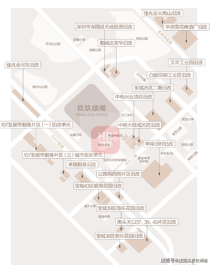 新安片区,尤其是在沿前进路正在进行着大规模的城市更新,分布着共20个旧改项目,超千万的旧改体量,相当于新安整个片区重建。仅我们项目2公里范围内就汇聚了8个旧改项目,分别是沃尔玛购物广场片区旧改、安华工业东区旧改,卓越翻身旧改、宝城碧海花园旧改、公路局西侧旧改、甲岸村旧改、宏发新领域、中洲中央公园二期。