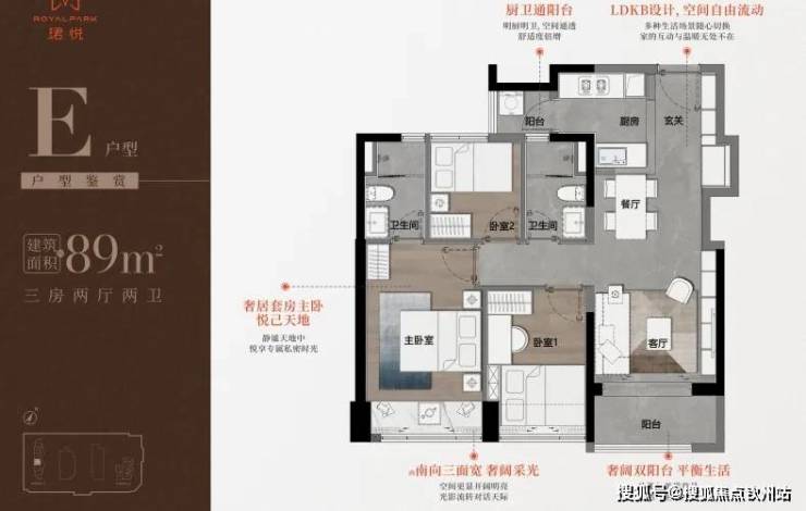 89㎡三房二卫C/D/E户型,户型基本一致,传统竖厅格局,都是西南向看向裕安学校和后面的城中村