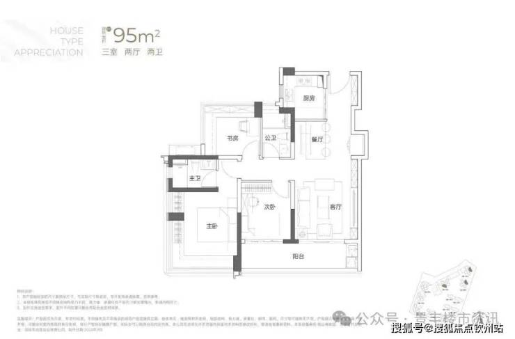 95㎡的3房2厅2卫:传统竖厅格局,客厅开间3.5米,LDKB一体化,S墙设计预留冰箱卡槽位,3个卧室分别做到了3.6米/2.8米/2.8米的宽度,主卧加1个次卧270°全景飘窗,客厅连接次卧出6.3米长的大阳台,U型厨房,得房率约95-97%(包含赠送),西南或东北朝向。户型分布在2栋2/3单元04/05户型,东北朝向看大南山、2栋1单元04/05户型西南朝向看小区;