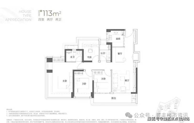 建面113平米:4房2厅2卫,传统的竖厅户型动静分区,‘S’型墙体,有冰箱预留位;市面非常常见的竖厅4房户型,比较突出的是有大阳台连接客厅和次卧;主卧和书房(卧室)都是多飘窗设计,保证了视野和多方面的采光;这种户型的缺点是走廊过长,空间利用率比横厅或者双龙抱珠户型差些;户型分布在5栋、6栋03/04户型,均是西南朝向,看小区外面大南山方向,比较安静;