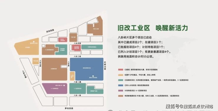 旧改工业区 唤醒新活力八卦岭片区多个项目已启动,其中已建成项目2个,在建项目3个,已批规划项目4个,列入计划项目1个,计划待批项目1个,有更新意愿项目4个。拆除用地面积合计约55公顷。