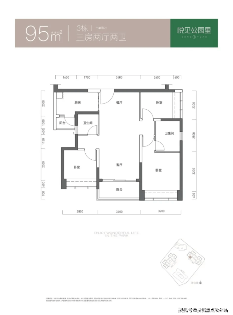 95㎡的3房2厅2卫,仅3栋1单元01户型,设计的是竖厅双龙抱珠格局,客厅3.4米开间,三开间朝南,3个卧室分别做到了主卧11.97㎡/次卧7.47㎡/次卧7.17㎡(实测面积,去掉墙体),L型厨房带1个生活阳台,公卫三段式分离,得房率73.71%(不含赠送),西南朝向。