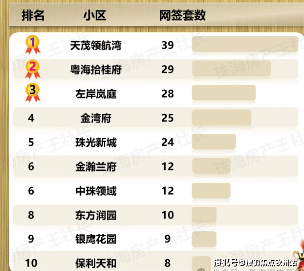 金湾区天茂领航湾10月网签39套,排名第一;粤海拾桂府29套排名第二;左岸岚庭28套排名第三