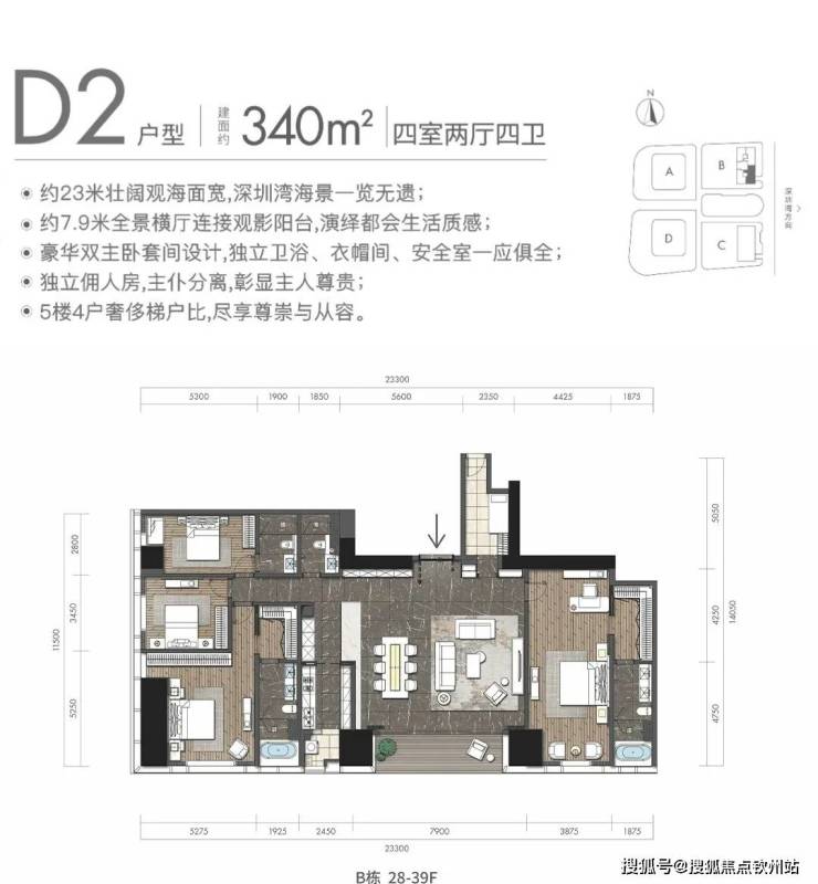 观景阳台:高区340平米户型,东面23米宽无敌海景视野(塔楼总观景面约46米)