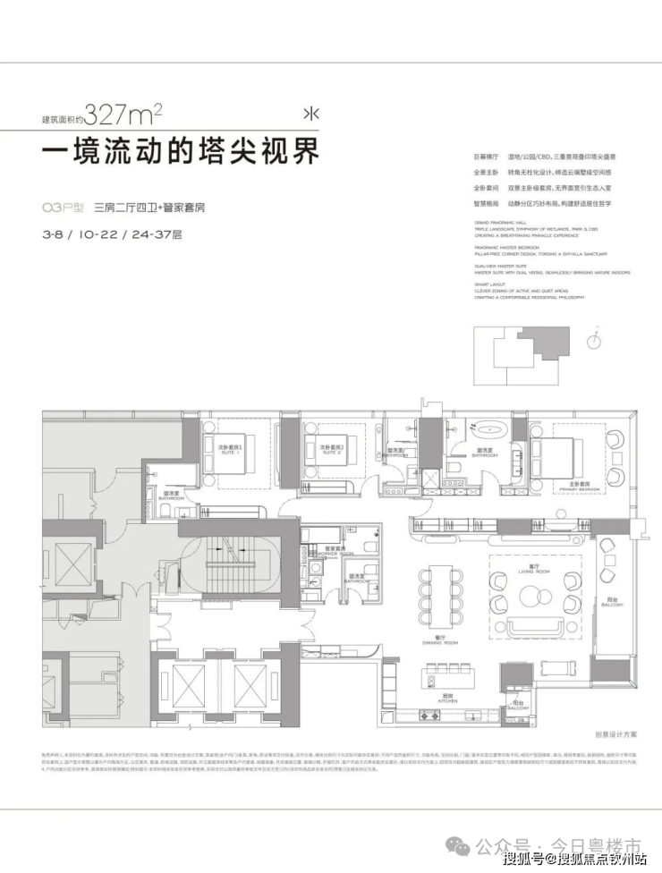 公寓主力户型为304㎡、327㎡、402㎡、570㎡以及1032㎡,公寓层高3.6米,低区5T3,高区5T2。