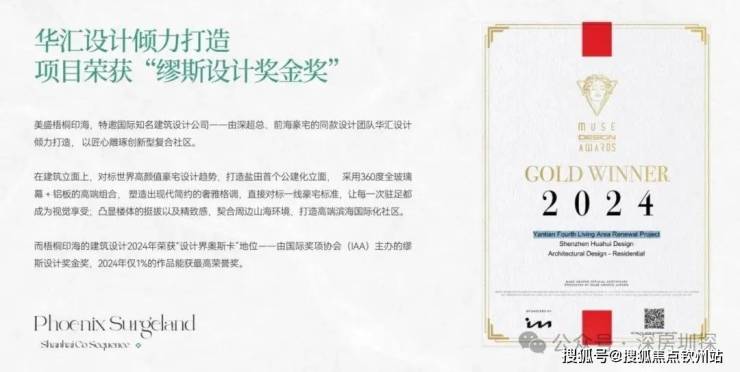 建筑大师:特邀深超总/前海豪宅同款设计团队华汇设计操刀,其作品从全球近3.8万件中脱颖而出,斩获有“设计界奥斯卡”之称的2024年国际奖项协会(IAA)缪斯设计奖金奖,该奖项仅约1%作品可获最高荣誉;