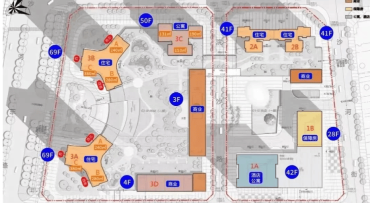小区物业包括住宅、商业和办公三种类型,主要由5栋高层住宅楼和2栋商业写字楼构成。