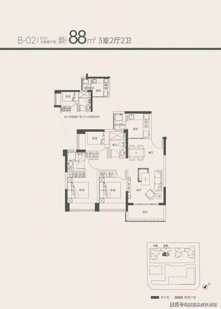 位于1B座是两梯四户的格局,尺度感不亚于目前市面上95㎡的产品。
