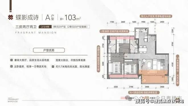 (2)103㎡三居室:全明格局,功能分区明确,兼顾居住舒适度。