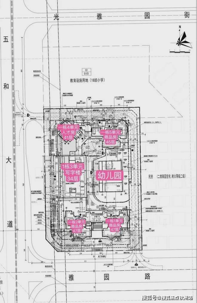天璞世纪雅园小区2栋楼共分为4个单元,其中商品房3个单元,人才房1个单元41层,还有1栋办公楼、1所幼儿园。小区北边规划有18班小学一所。