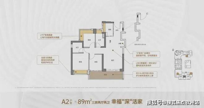 A2户型-约89㎡3房2厅2卫:户型分布在1、2、5单元,阳台南向、东向、西向均有选择。