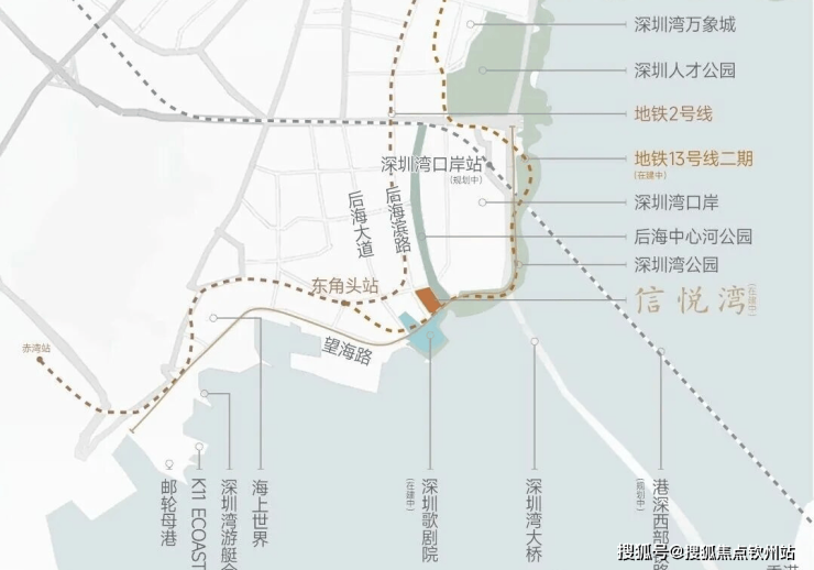 在交通配套方面,项目临近在建的13号线歌剧院站与地铁2号线东角头站,这条是含金量很高的贯穿南北的黄金快线,串联深圳湾、南山、科技园、西丽等高新产业区。
