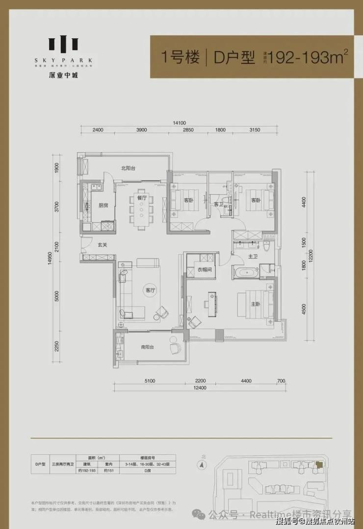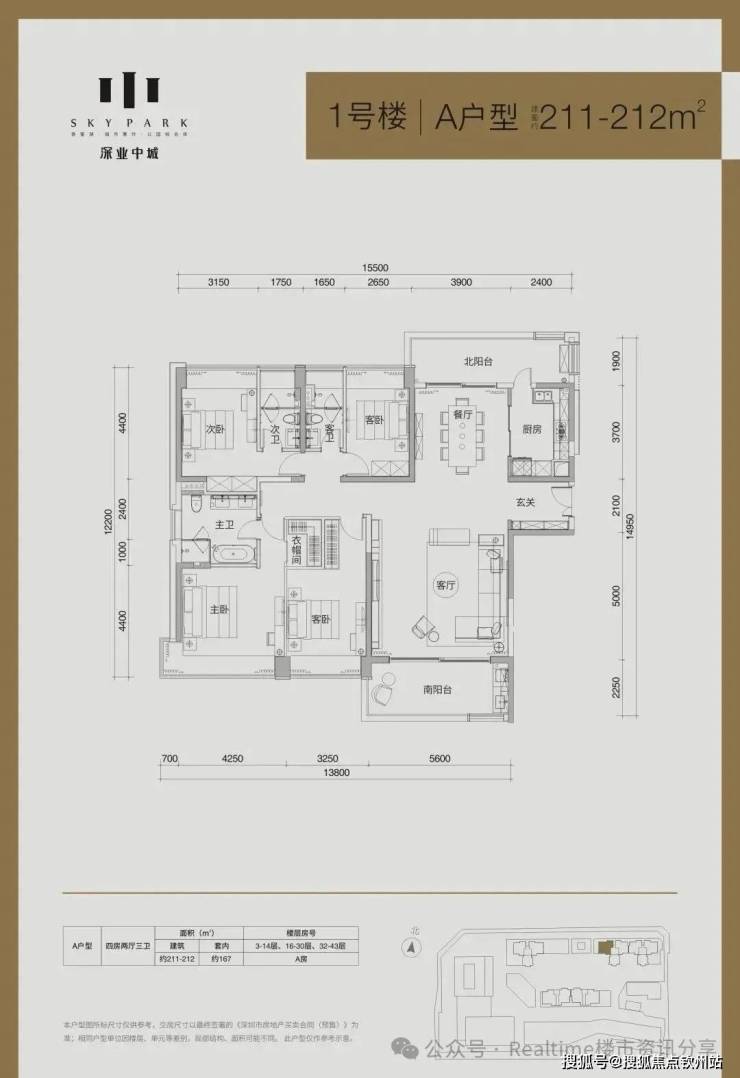 1栋:产品是面积段为137-185-192㎡的3房、212㎡的4房、以及4套300㎡以上的顶层复式单位,其中36层及以下为2梯3户“品”字形结构,37层及以上为2梯2户的板楼结构;