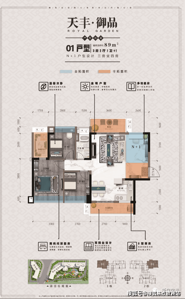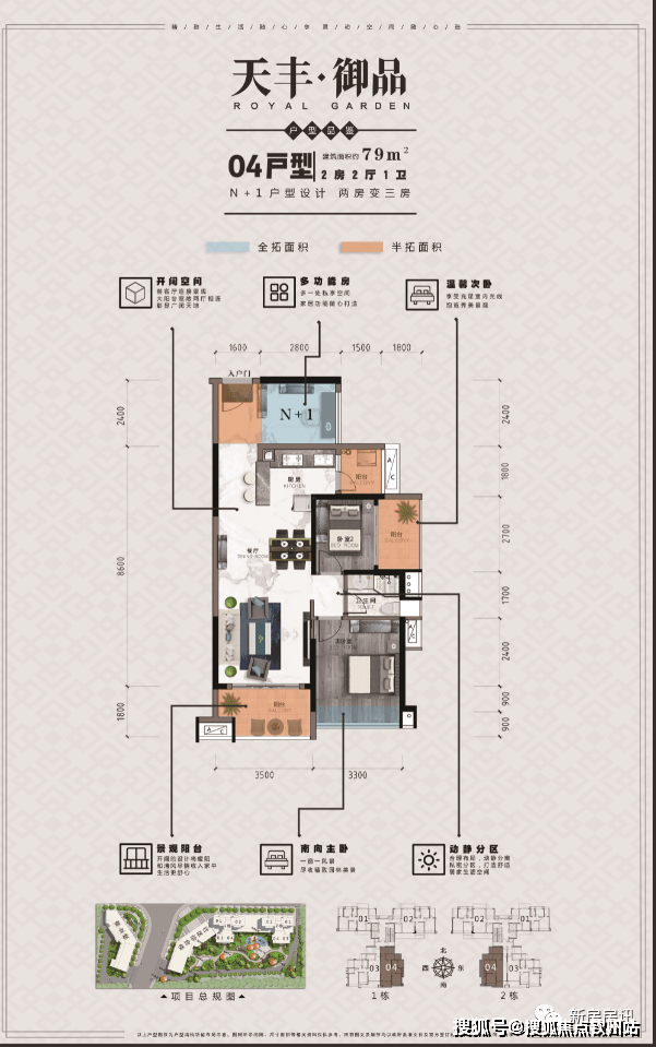 中山·天丰御品在户型上主打两梯四户的N+1房系列,一共92套,毛坯出售,建筑面积约79-118m²。建面约79㎡ 2房2厅1卫:可做三居室,客厅开间达3.5米,方正实用,采光通风功能极佳,南向阳台和主卧都可以直面园林美景,极致的户型充分满足刚需客户的需求。