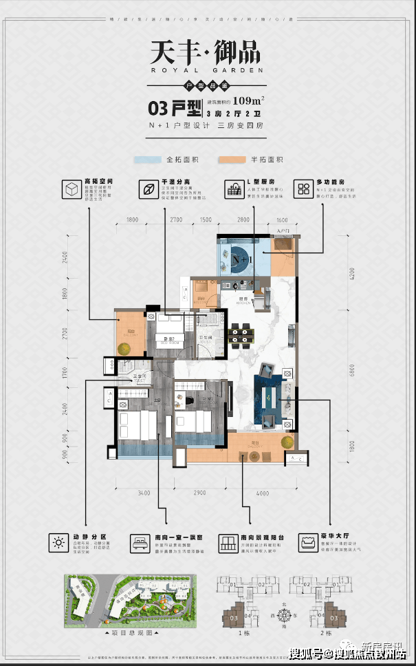 建面约109㎡ 4房2厅2卫:109m²可做舒适四房,带一个套间,双阳台双卫生间,纯南向景观阳台,主阳台可俯视园景,动静皆宜。