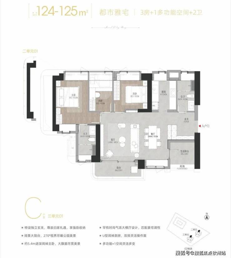 01 C户型——建面约124-125㎡3+1多功能空间 : 横厅户型,双阳台设计,西北朝向,看向绿地公园及花园。大横厅+通透采光:采用“双厅合一”的大横厅设计,摒弃多余过道,让客餐厅空间感直接拉满。