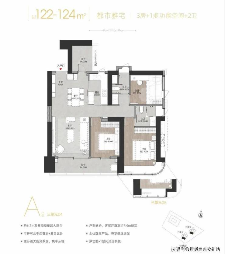 04/05 A户型——建面约122-124㎡3+1多功能空间 : 竖厅户型,双阳台设计,西南朝向。