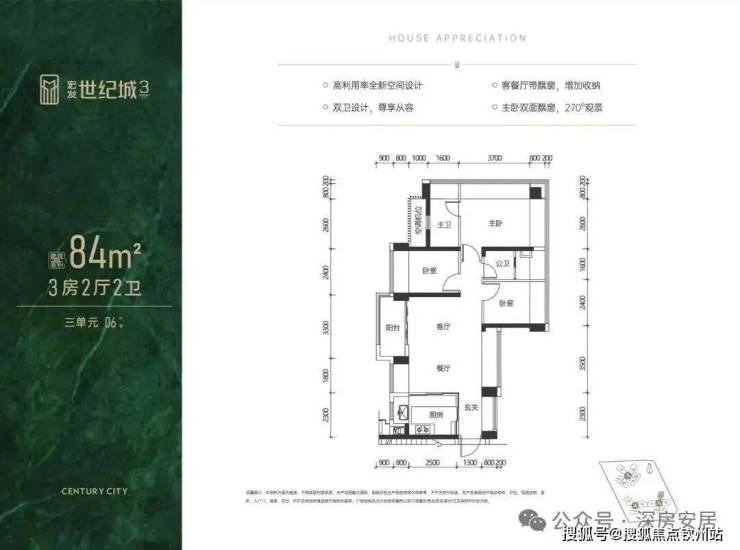 84㎡的3房2厅2卫,设计的是横厅南北通透格局,客餐厅5.1米开间,LDKB一体化设计,全屋10面飘窗,五开间朝南,主卧双面飘窗270°观景,3个卧室分别做到了主卧15.3㎡/次卧8.16㎡/次卧7.68㎡(包含墙体飘窗),U型厨房,卫生间干湿分离,阳台5.61㎡主朝西南向(差不多正西)。得房率约103.32㎡(包含赠送),赠送面积有22.8㎡。