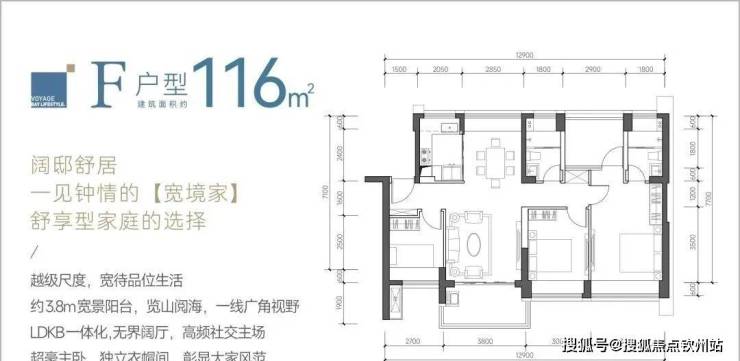 116㎡的4房2厅2卫,F户型,设计的是竖厅南北通透格局,餐客厅一体化设计,客厅3.8米开间,四开间朝南,4个卧室分别做到了主卧18.02㎡/次卧12.3㎡/次卧8.7㎡/次卧8.37㎡(包含墙体飘窗),都不用搭配飘窗做床,L型厨房,卫生间干湿分离,得房率约:88%(包含赠送),阳台主朝西南或东南向。