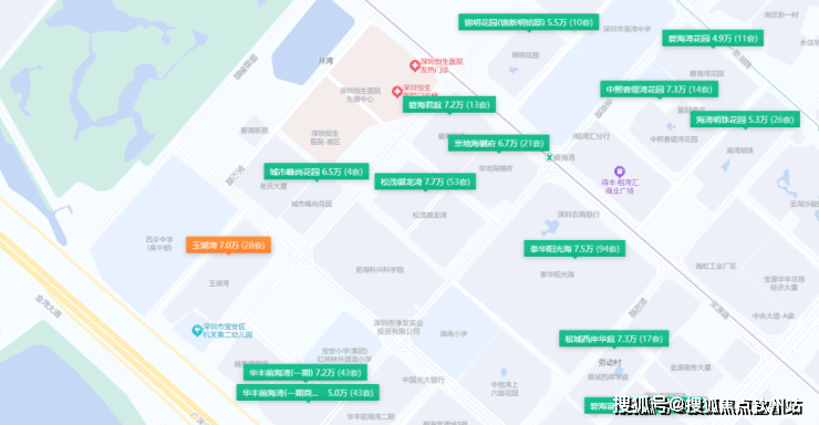 楼龄十年左右的松茂御龙湾一期和二期,以及华丰前海湾一期和二期,成交均价都在7.5万/㎡左右。