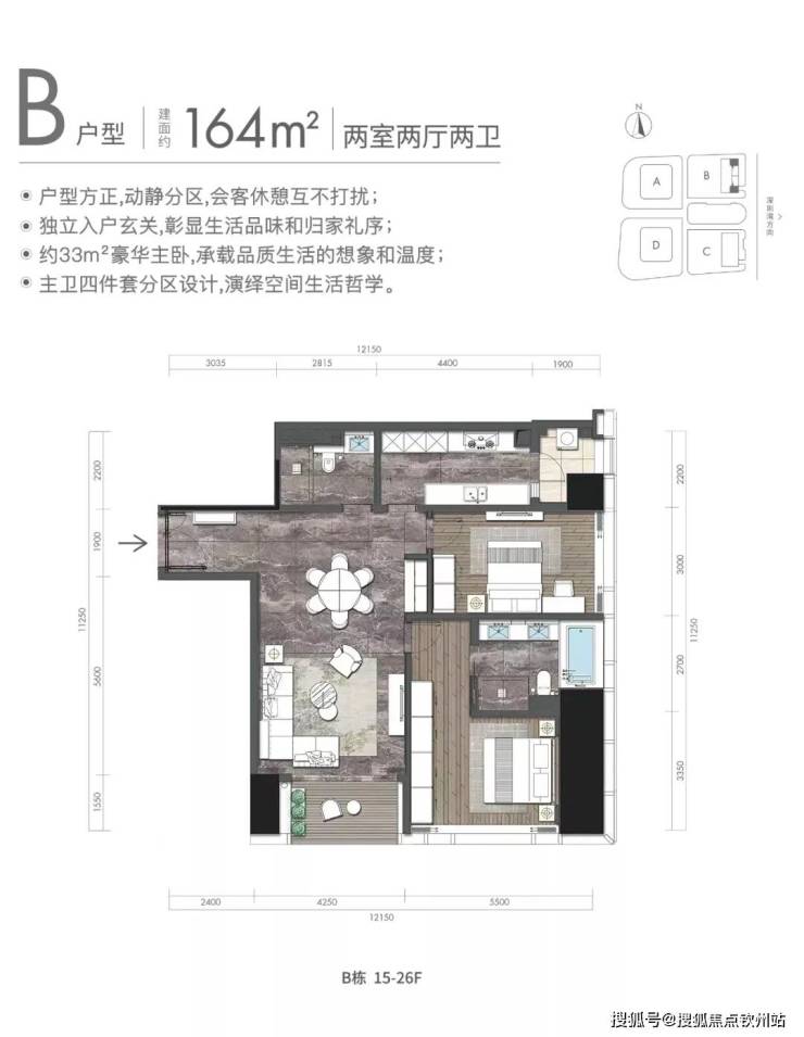 约164㎡2房2厅2卫(独立入户玄关,动静分离,约33㎡豪华主卧,承载品质生活)